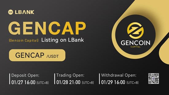 Internet City, Dubai–(Newsfile Corp. – January 26, 2022) – LBank Exchange, a global digital asset trading platform, will list Gencoin Capital (GENCAP) on January 28, 2022. For all users of LBank Exchange, the GENCAP/USDT trading pair will be officially available for trading at 18:00 (UTC+8) on January 28, 2022.