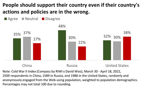 Toronto, Ontario–(Newsfile Corp. – April 21, 2022) – A new Compass Cold War II (CW2) Index launched by data firm RIWI (TSXV: RIWI) (OTC Pink: RWCRF)(Real-Time Interactive Worldwide Intelligence) and macro strategist and Unbound founder, David Woo, shows that, as of April 18, 2022, half of Russians remain uncritically loyal to their country. Forty-eight percent of Russians agree that “people should support their country even if their country’s actions and policies are in the wrong.” This compares with 35 percent of Chinese and 32 percent of Americans who are uncritically loyal to their countries. To learn more about the study, visit: https://riwi.com/research/how-do-russians-americans-and-chinese-perceive-the-new-cold-war/.