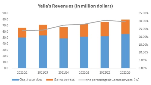 In Q3 2022, the number of monthly active users (MAUs) was 30.9 million, representing a YoY increase of 19.1% and a QoQ increase of 3.3%. Growth in MAUs has been seen for 10 consecutive quarters. This is the first time that the MAUs of Yalla topped 30 million.