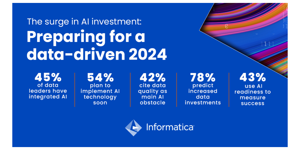 REDWOOD CITY, Calif.–(BUSINESS WIRE)–Informatica (NYSE: INFA), an enterprise cloud data management leader, released the findings of its annual survey of global data leaders – CDO Insights 2024: Charting a Course to AI Readiness. The report, which canvassed 600 enterprise Chief Data Officers and other data decision makers across the U.S., Europe, and Asia-Pacific, provides insights into generative AI readiness, key technical and organizational roadblocks to implementation and top data and data management priorities and strategies for 2024.