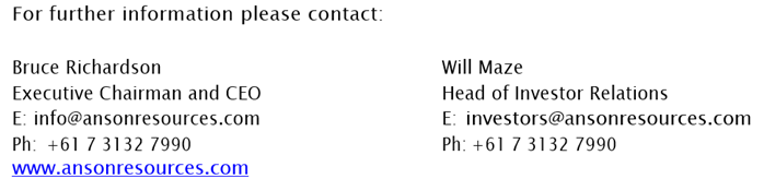Forward Looking Statements: Statements regarding plans with respect to Anson’s mineral projects are forward looking statements. There can be no assurance that Anson’s plans for development of its projects will proceed as expected and there can be no assurance that Anson will be able to confirm the presence of mineral deposits, that mineralisation may prove to be economic or that a project will be developed.