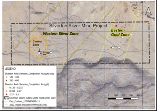 Past surface rock sampling of the Central Zone indicates a 150 metre wide zone of silver mineralization, staring at the Silverton Fault and spanning westwards, with samples of 692 ppm Ag, 330 ppm Ag, and an additional five samples above 100 ppm Ag from Company exploration work (please refer to the Company’s press release dated November 29, 2021 for previous disclosure). Silicification, characteristically associated with the epithermal-type and carbonate-replacement type of mineral occurrences has been identified in: the Central Zone in the Silverton Fault; the Basin Fault and in the NW Mineralization Zone (parallel to and north of the Basin Fault).